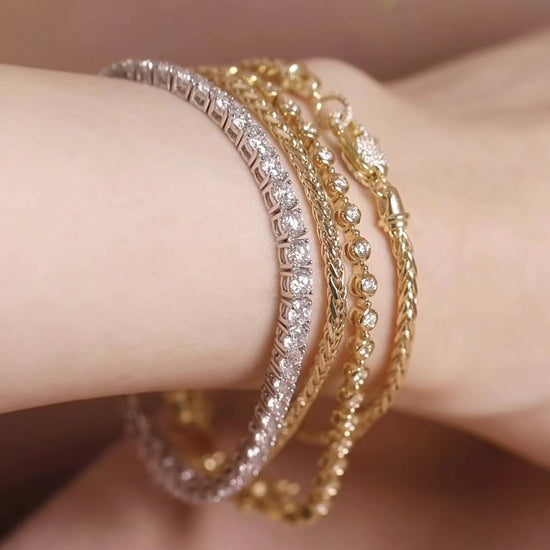 This Bezel Diamond Tennis Bracelet is crafted from 18K yellow gold and features a classic, chic design. Round diamonds are bezel set for a simple, elegant look. Perfect for daily wear, this bracelet is sure to add a touch of sophistication to any outfit. Wear yours alone or stacked with other pieces from your personal collection.